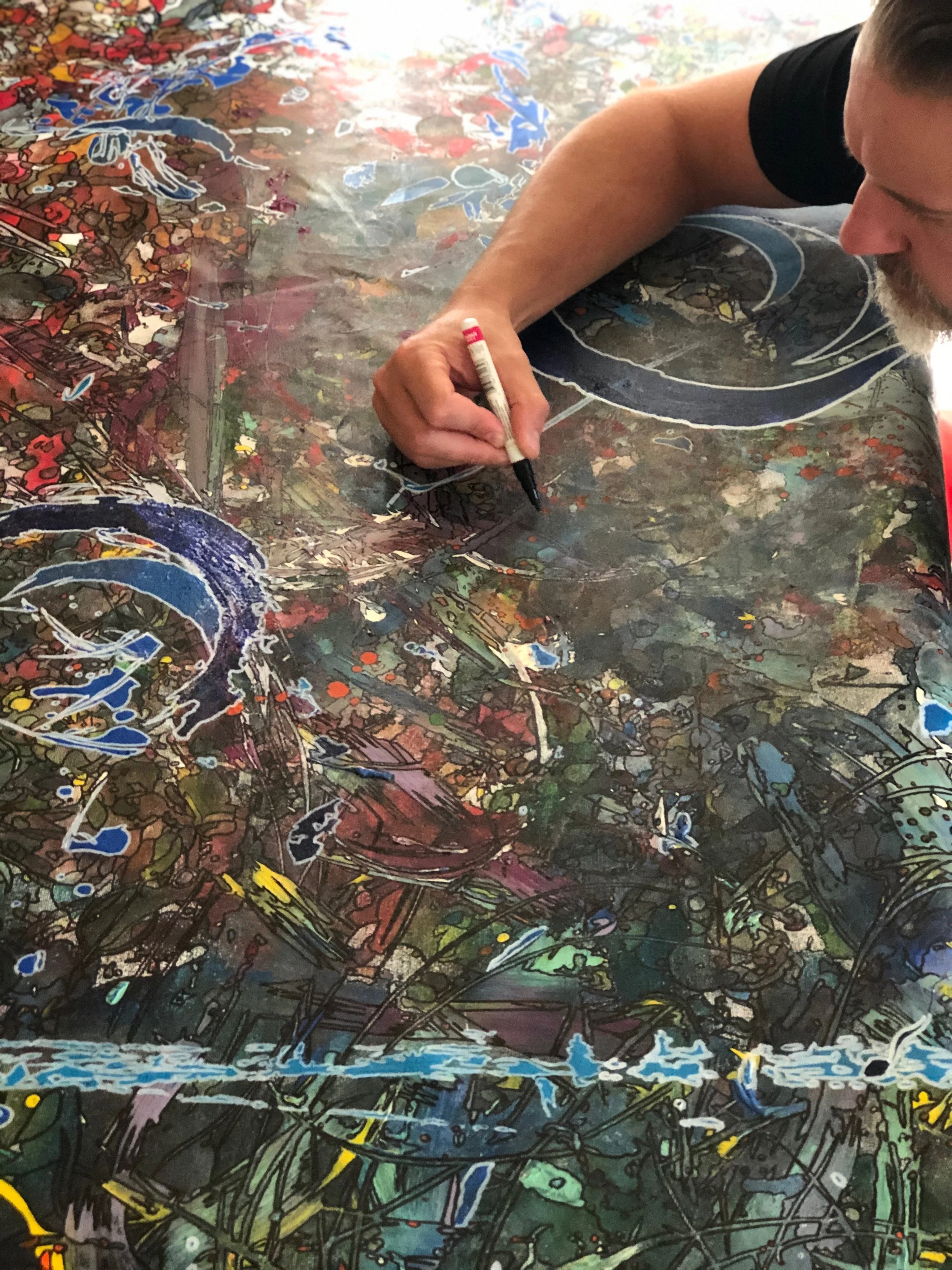As a small boy he was given a spiral notebook for school. One day while doing sketches at the kitchen table, he knocked over a glass of water that was sitting next to him. The water then proceeded to seep into the cardboard backing of the notebook and leave a stain, a stain that he found most unappealing. In order to help make the the stain look less like a stain and more like a piece of art, he began to outline the stain with ink. He found that the process was not only satisfying emotionally, but the image that was created was pleasing to his eye. So, from then on whenever something chaotic happened where a stain, splotch or smear appeared on one of his pages, he outlined it! He would continue this process to this day. He wouldn’t realize just how important that little accident with a glass of water would be until his senior year of college. His art professor, the renowned painter Mark Smith, would task him with an assignment that would change the way he painted forever. The assignment was to come up with an original painting, done in your own style, that those looking at it would know it was done by you. When you’ve studied the techniques and styles of famous painters throughout history, you can tell a Van Gogh is a Van Gogh and a Picasso is a Picasso- but what in the world is a Parker?! Then he remembered the spilled water accident. Could this be done with paint? He found that the answer is Yes!